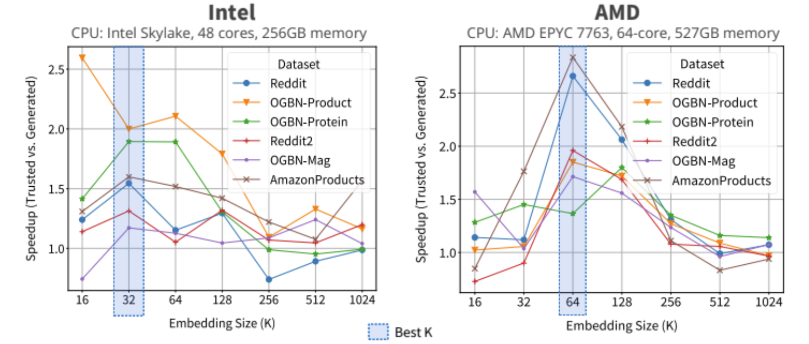 I also built a Python interface for FusedMM’s auto-tuner, compatible with graph datasets in MTX format. The auto-tuner includes fallback kernels for robustness. By benchmarking generated kernels against fallbacks across embedding sizes, we generate speedup curves—typically parabolic, peaking at the optimal embedding dimension before register spilling degrades performance. For most datasets, iSpLib peaks at embedding size 32 on Intel CPUs and 64 on AMD CPUs (e.g., on NERSC supercomputers), largely due to AMD’s larger cache.