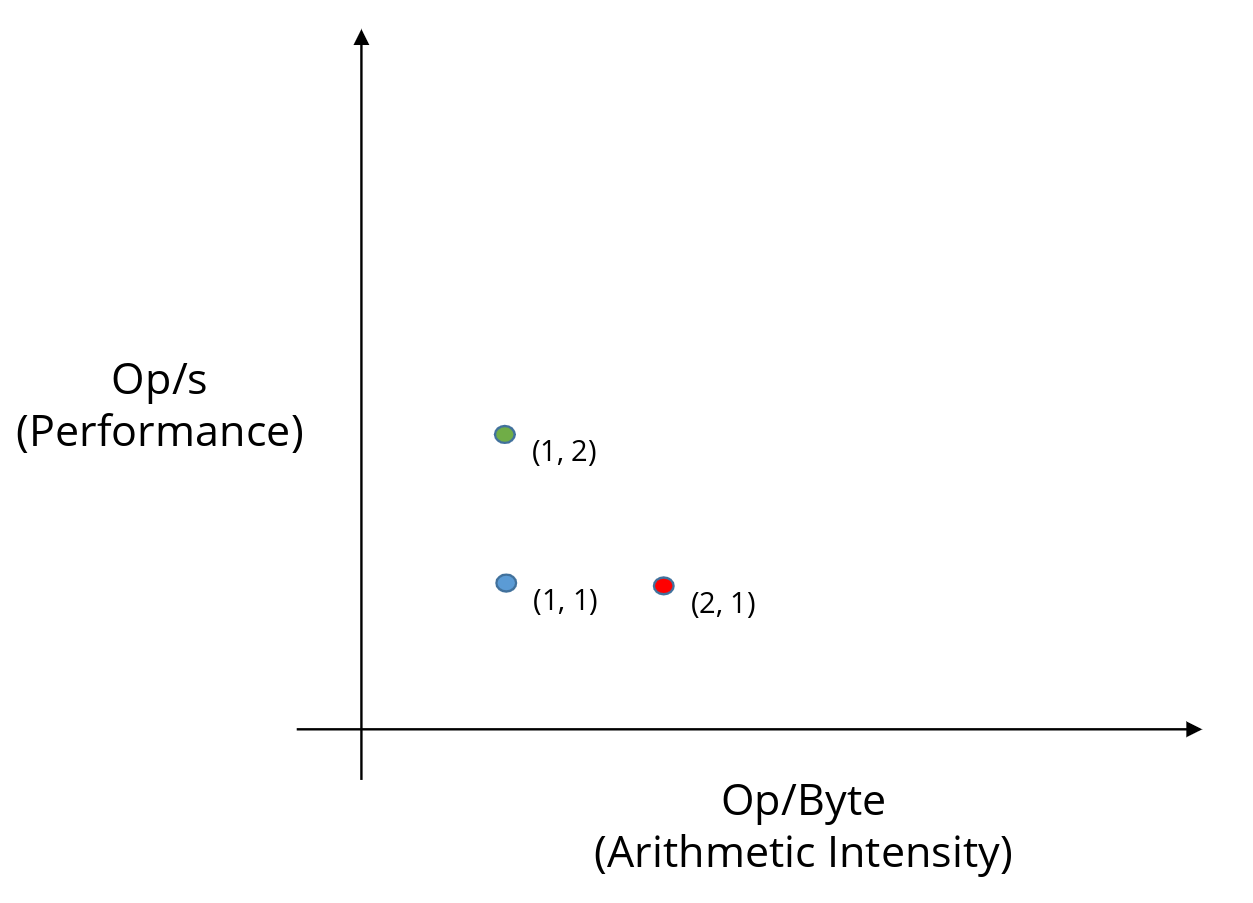 So far, this suggests that we may not be fully utilizing the data we already have. Suppose we improve arithmetic intensity (move right, toward the red point) and then try to increase performance by moving upward.