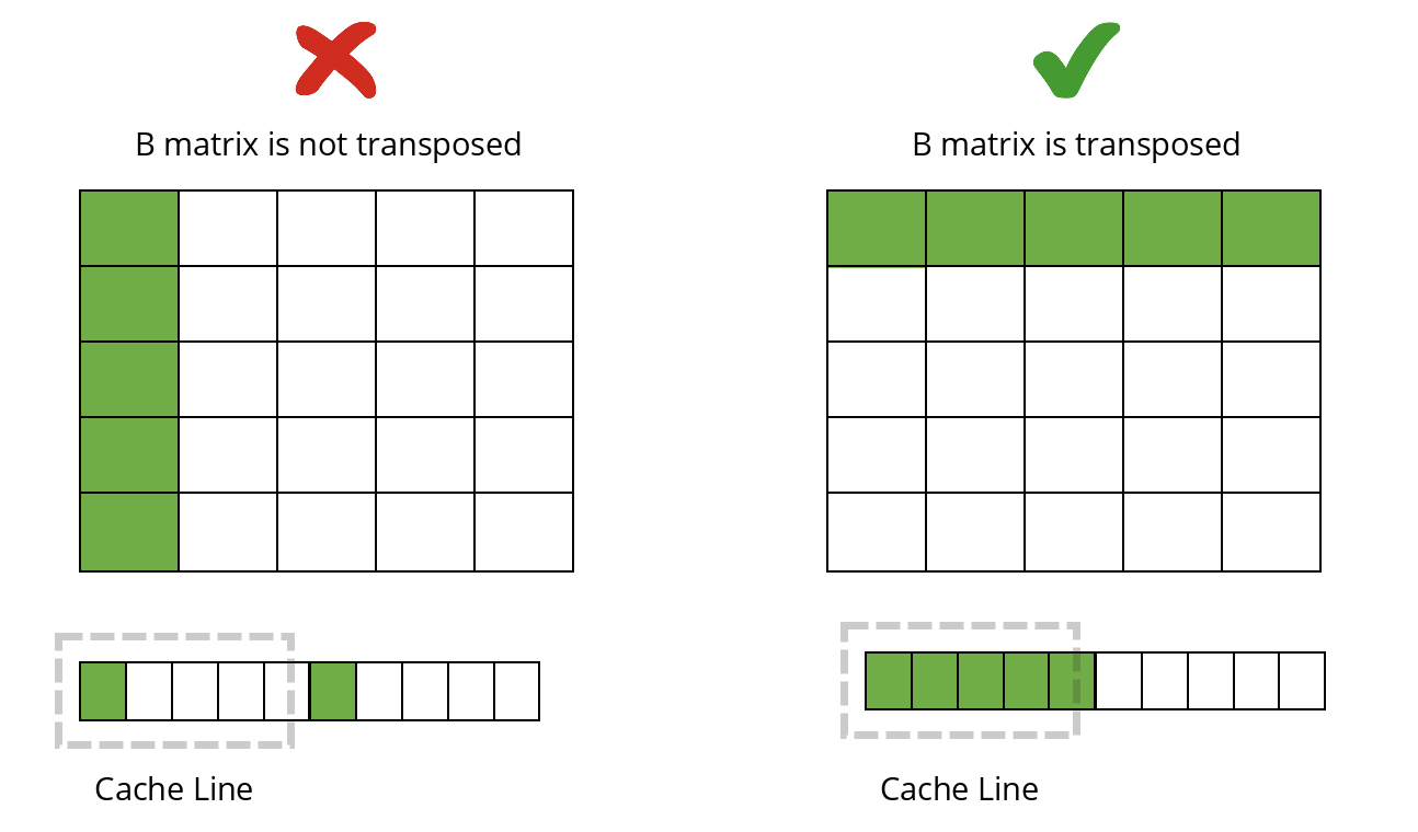 If we instead use a transposed B matrix, accesses become contiguous in memory. This improves cache reuse and allows us to perform more operations with the same bytes fetched.