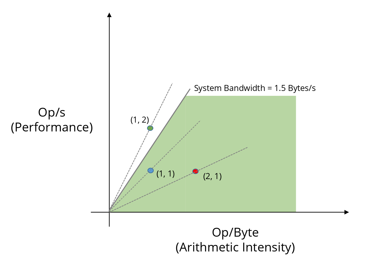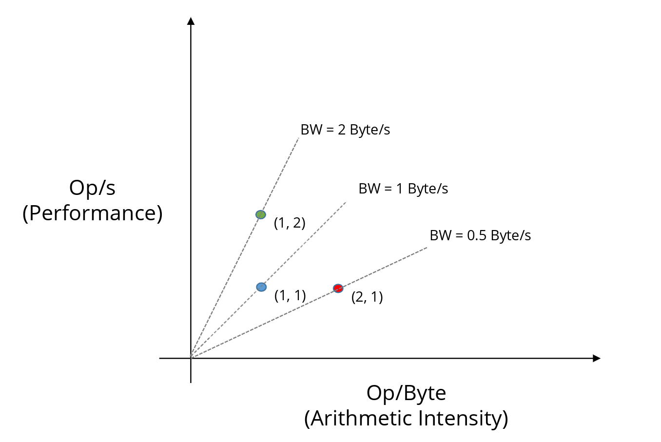 This is because each point represents a specific pairing of arithmetic intensity and performance. For the blue point, executing 1 op/s at an arithmetic intensity of 1 op/byte implies that the memory system must supply data at 1 byte/s, i.e., the required bandwidth is 1 byte/s.