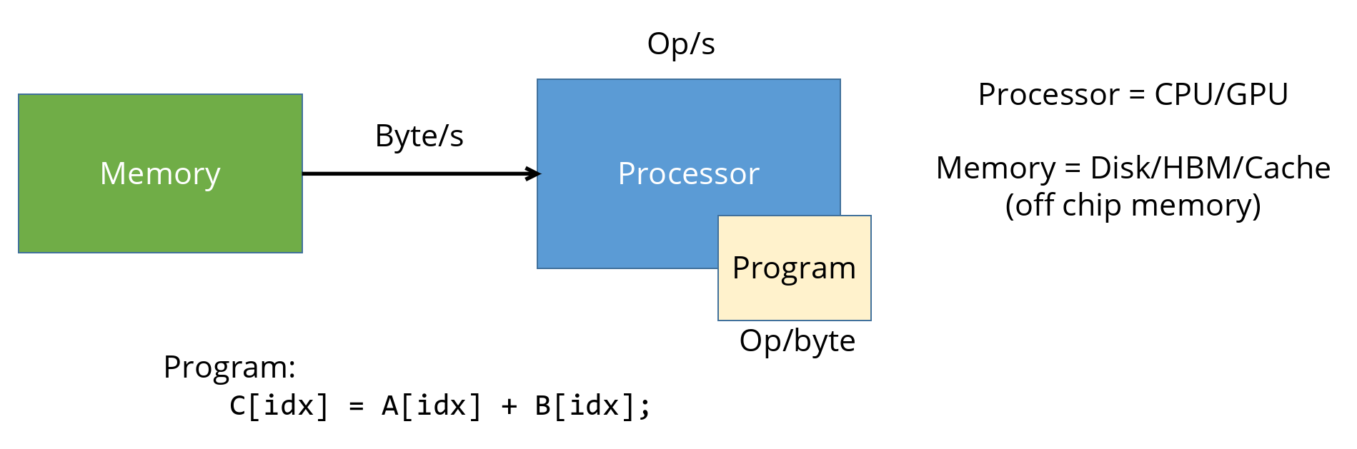 In other words, for every byte fetched from memory, the program performs 1/8 of an operation. This metric captures how effectively a program uses the data it moves. Arithmetic intensity is a property of the program (or its implementation/kernel).