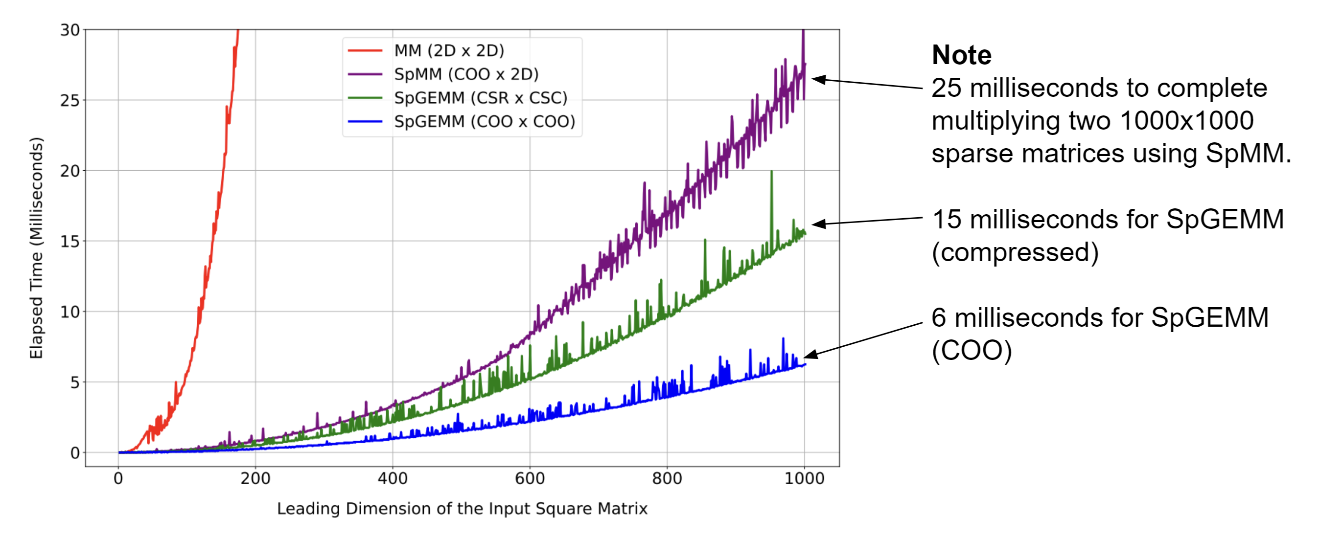 In this project, we benchmark the performance of various matrix multiplication techniques using sparse matrix data structures. The evaluation focuses on the regular Matrix Multiplication (MM), Sparse Matrix Multiplication (SpMM), Sparse General Matrix Multiplication (SpGEMM), and SpGEMM with CSR format (SpGEMM_CSR). The experiments involve generating random sparse matrices of increasing sizes (2x2, 3x3, up to 5000x5000), with the density of non-zero elements set to \(1/n\) where n is the matrix size. Each function is executed 20 times to account for variability, and the average elapsed time and memory allocation are measured for each method to assess their efficiency. The comparison focuses on matrices of up to 1000x1000 for speedup analysis and up to 5000x5000 for memory usage evaluation.